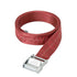Red industrial belt with silver buckle. "Off-White BELT" carved on buckle.