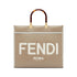 Medium Sunshine shopper made of dove gray leather, featuring leather threading and hot-stamped white FENDI ROMA lettering. Stiff tortoiseshell-effect plexiglass handles.