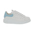 White smooth calf leather lace-up sneaker trimmed with a powder blue suede heel counter. The sneaker features large flat laces and an oversized rubber sole. Finished with an Alexander McQueen signature on tongue and heel counter. Oversized rubber sole with signature stamp design. The sneakers come with an additional lace set. To lessen our environmental impact and to reduce cotton consumption, we will no longer be providing a dust bag with our sneakers.