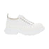 White canvas lace-up with a lightweight oversized rubber tread sole. The lace up is detailed with a textured rubber wrap and tonal Alexander McQueen signature, finished with a signature ribbon on the heel of shoe. Round toe shape silhoutte details rubber toe cap.