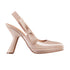 • The Sweet-D slingback pump combines elegance and modernity. The nude patent calfskin upper is subtly contrasted by a slingback strap in shiny calfskin enhanced by a gold-tone Christian Dior Paris signature and tonal flat bow. The 10.5 cm (4) thick comma heel and 1.5 cm (0.5) platform add a refined touch to any seasonal look.