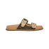 Double-band flat slides with FF Baguette decorative buckles. Made of Jacquard fabric with FF motif in brown. Light brown leather edges. Gold-finish metalware.