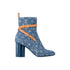 • The iconic Silhouette ankle boot is revisited in bleached Monogram denim, coordinating with the season's leather goods. A decorative strap in natural calf leather with a gold-tone stud and buckle nods to historic Louis Vuitton trunks. This model is notable for its Monogram Flower-shaped heel, which is color-matched to the upper.