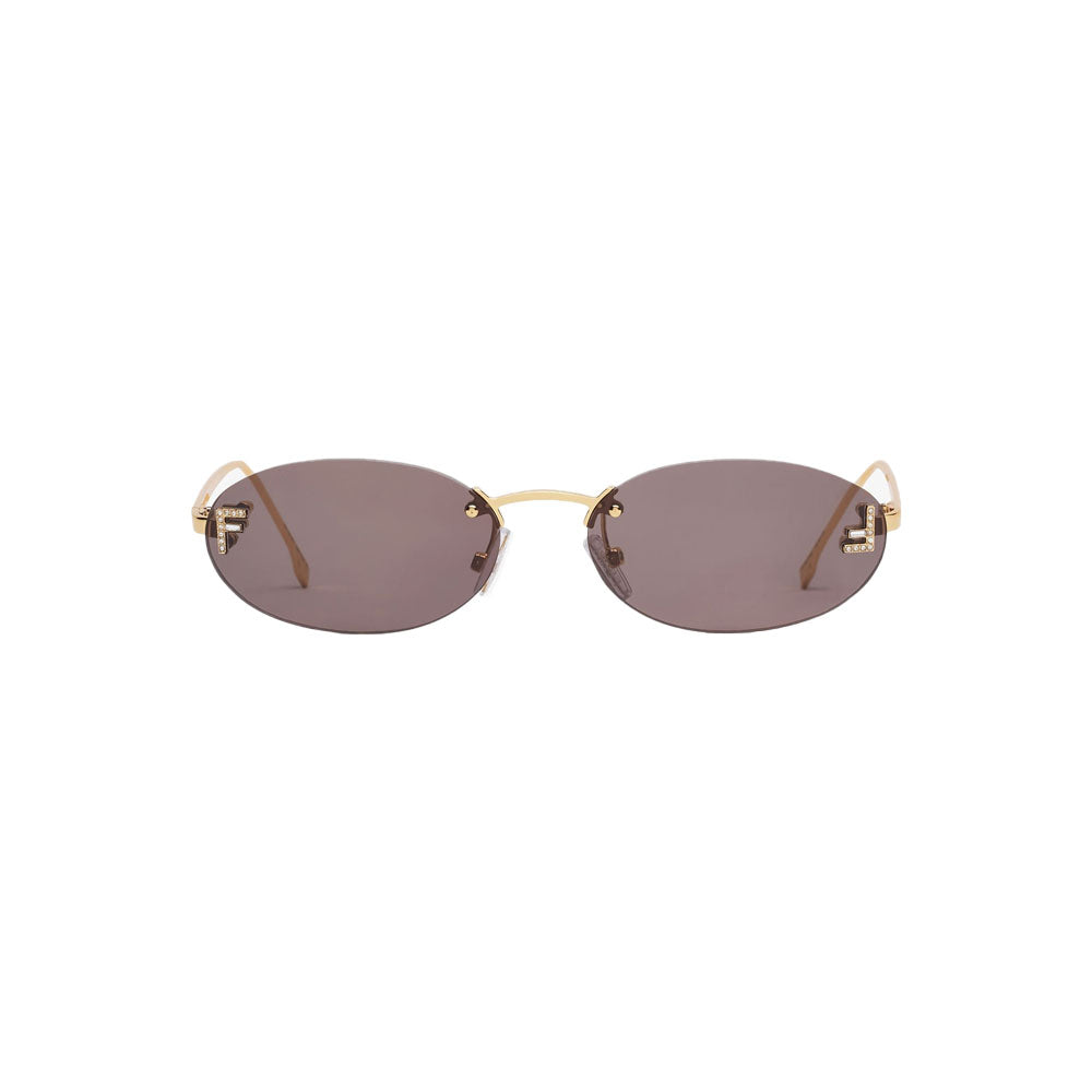 Oval Fendi First Crystal glasses with a gold-coloured rimless metal structure. Grey lenses embellished with micro F in crystals. Adjustable nose pads.