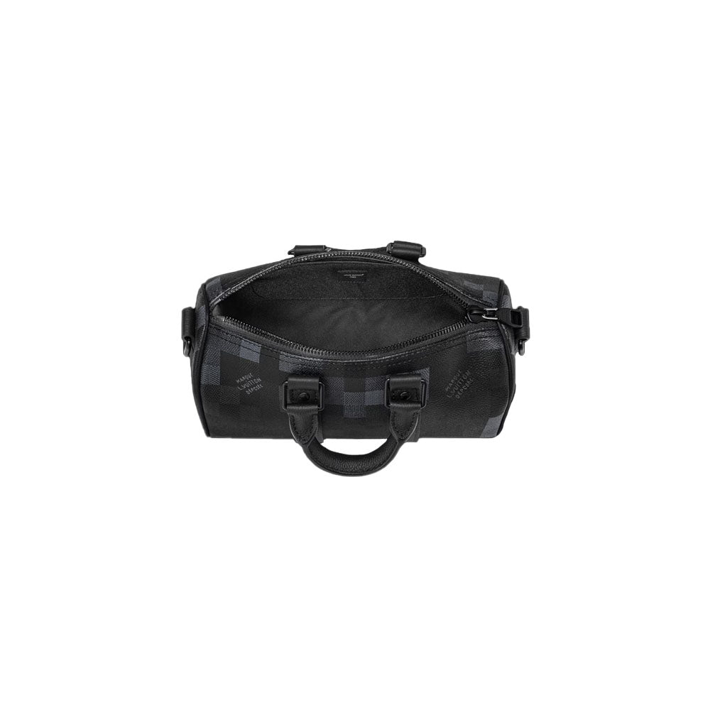 This Keepall Bandoulière 25 is crafted from Damoflage Black coated canvas, blending the heritage Damier Graphite pattern with Pharrell Williams’ new aesthetics. The iconic checkerboard pattern is subtly pixelated, creating a unique camouflage effect in a sleek black palette. Top handles and a detachable, adjustable strap offer carry options.