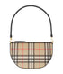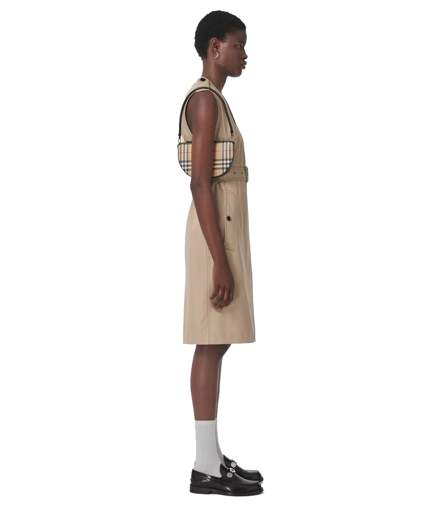 - A slim pouch in Vintage check and leather, with a curved silhouette – inspired by the architecture of our show venue, Olympia London. Wear on the shoulder or detach the strap to carry as a clutch.
