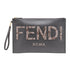 Large pouch with removable bracelet handle. Zip fastening. Made of dark grey leather with Fendi Roma lettering in python print elaphe. Gold-finish metalware.