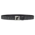 • Reversible belt. Rounded FF buckle with stud closure. Made of smooth black leather. Fabric lining with gray and black FF motif. Palladium-finish metalware.