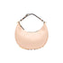 Small hobo bag made of soft pale pink leather, with vintage gold metal FENDI lettering visible when the bag is worn under the arm.