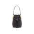 Small Mon Tresor bucket bag with drawstring fastening and metal decorations in the Fendi logo shape. Two detachable shoulder straps, one long and one short, to wear the bag over the shoulder or cross-body. Made of black calf leather. Iconic FF pattern created in a raised print. Gold-finish metalware.