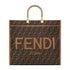 Sunshine Shopper bag made of fabric with brown FF jacquard motif and FENDI ROMA lettering in light brown leather and stiff leather handles.