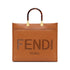 Medium Sunshine Shopper bag made from brown leather with heat-stamped “FENDI ROMA” and stiff tortoiseshell plexiglass handles.