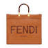Sunshine shopper made of brown leather with heat-stamped “FENDI ROMA” motif.