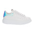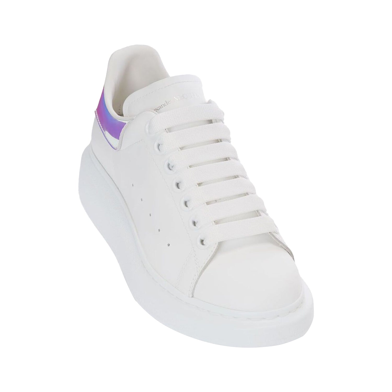 White smooth calf leather lace-up sneaker trimmed with pearlescent transparent fabrication layered over the white calf leather heel counter. The sneaker features large flat laces and an oversized rubber sole. Finished with an Alexander McQueen signature on tongue and heel counter. Oversized rubber sole with signature stamp design. The sneakers come with an additional lace set.