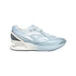 First 1 sneakers featuring elastic laces and corrugated soles with a diagonal F-shaped sculpted detail. Made of nylon with white and light blue shading. Gray suede inserts. Customized with screen-printed Fendi lettering on the tongue and the side.