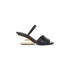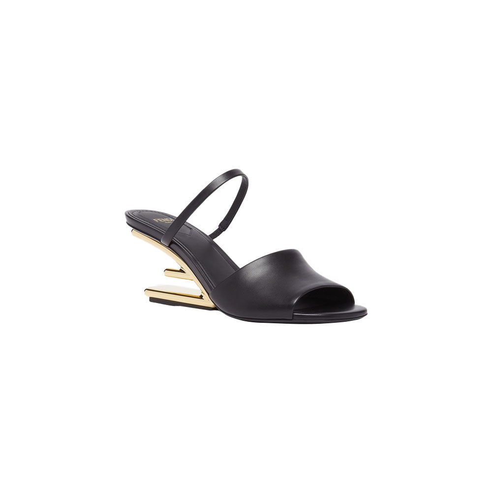 Fendi First sandals with wide band and strap. Made of black leather. Finished with tone-on-tone leather details. Diagonal F-shaped sculpted heel in gold-colored metal.
