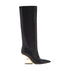 Fendi First boots with pointed toe and side zipper on the inside with Fendi O’Lock zipper-pull. Made of black leather. Diagonal F-shaped sculpted heel in gold-colored metal.