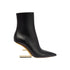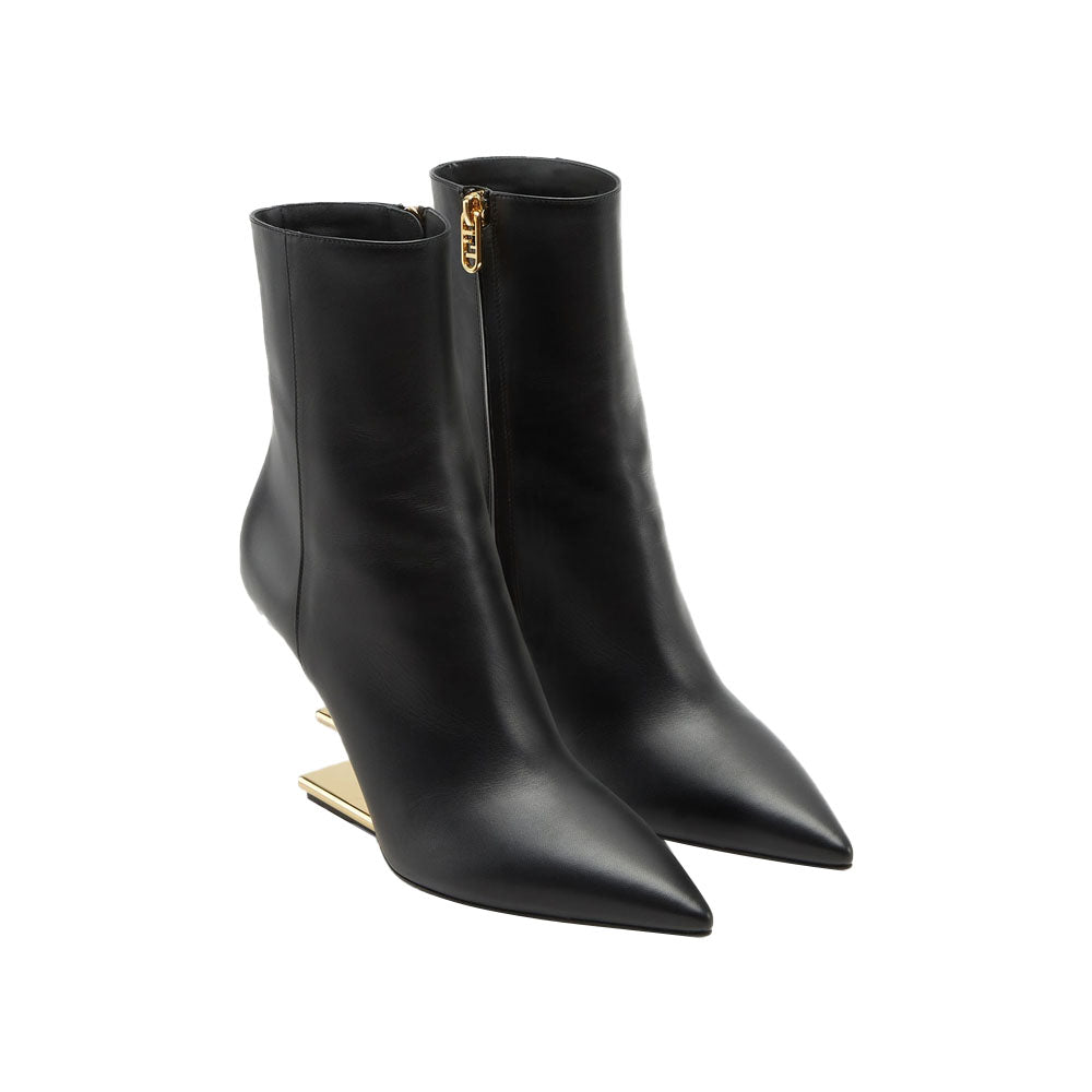 • Fendi First ankle boots with a tapered toe and inside side zipper with Fendi O’Lock ring. Made of black leather. Sculpted diagonal F-shaped heel in gold-colored metal.