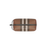 A compact travel pouch in check e-canvas – an environmentally conscious canvas, primarily made using renewable resources that require less water and generate less CO2 than conventional coated canvases. The design is highlighted with topstitched leather trims and our logo.