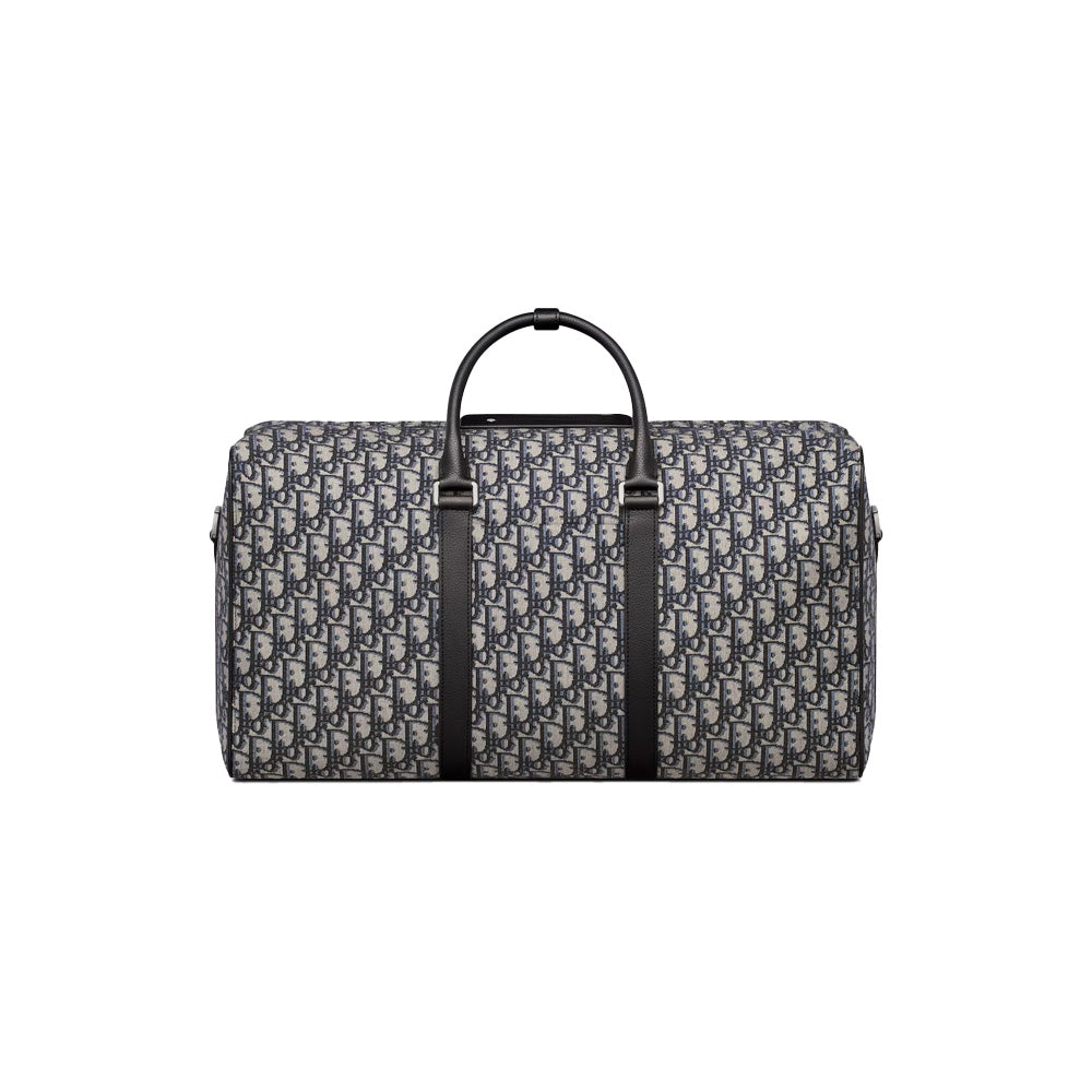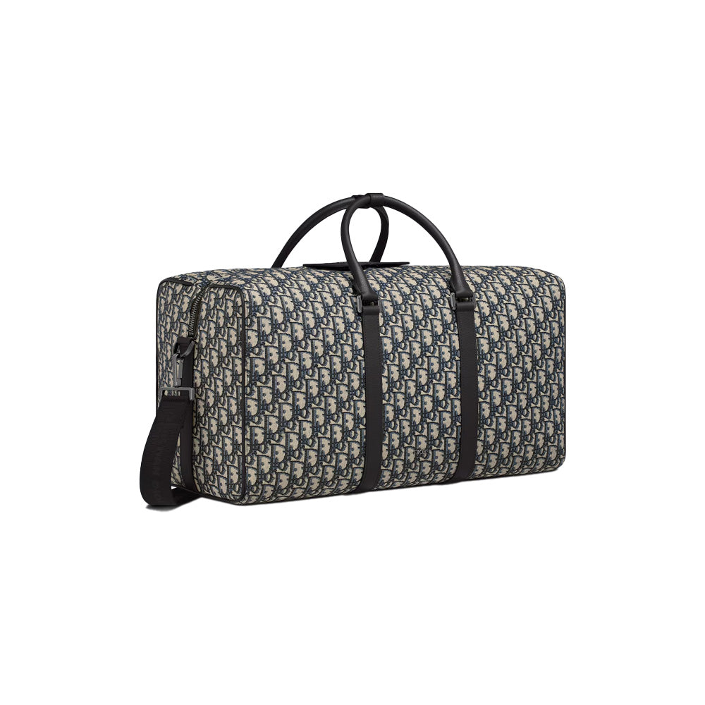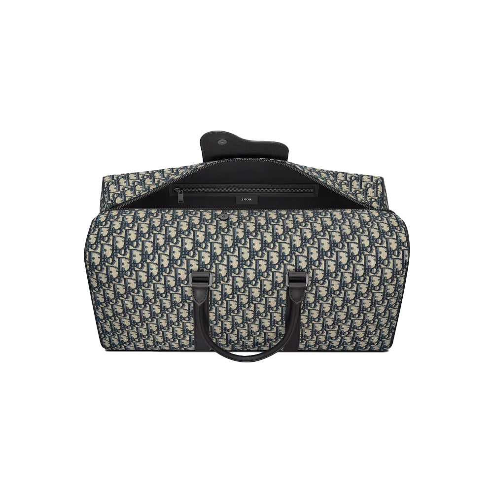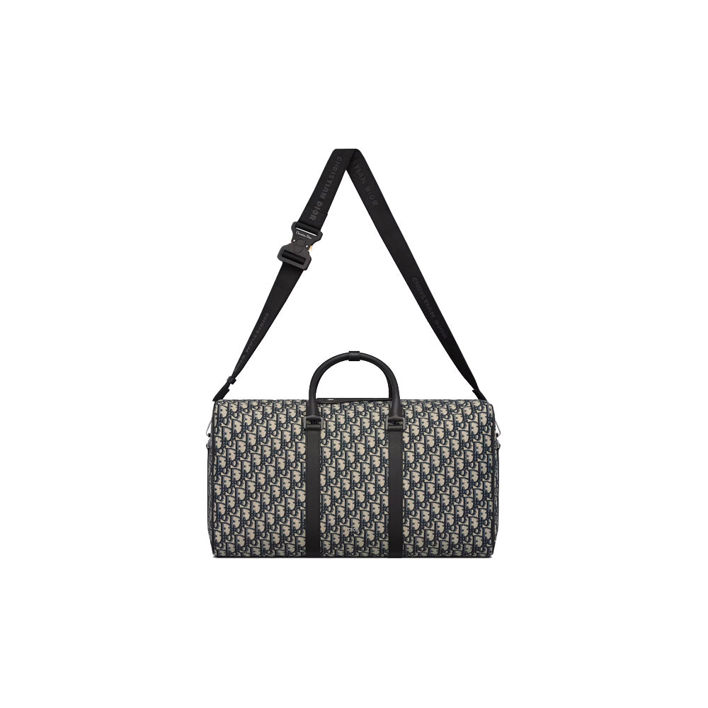 • New this season, the Dior Lingot 50 Duffle bag is distinguished by a functional and elegant design. The beige and black Dior Oblique jacquard is enhanced by black grained calfskin details and the Dior signature on the front. A zipped compartment with a Saddle flap will hold all the daily essentials. The folding top handles and adjustable, removable shoulder strap with an aluminum buckle allow the bag to be carried by hand, worn over the shoulder or crossbody.
