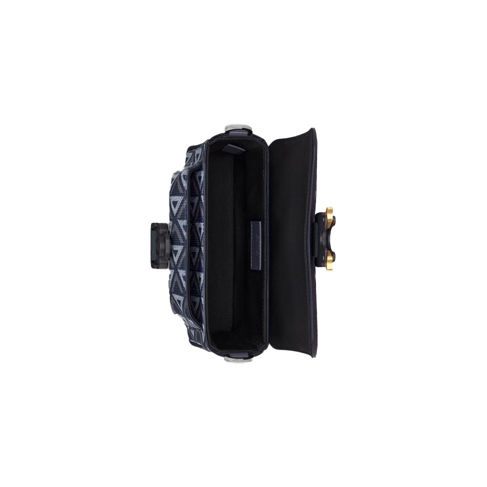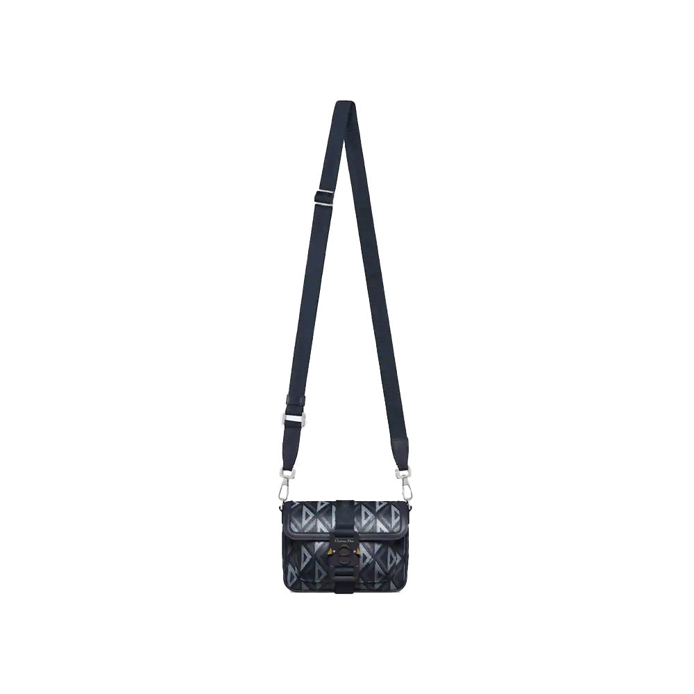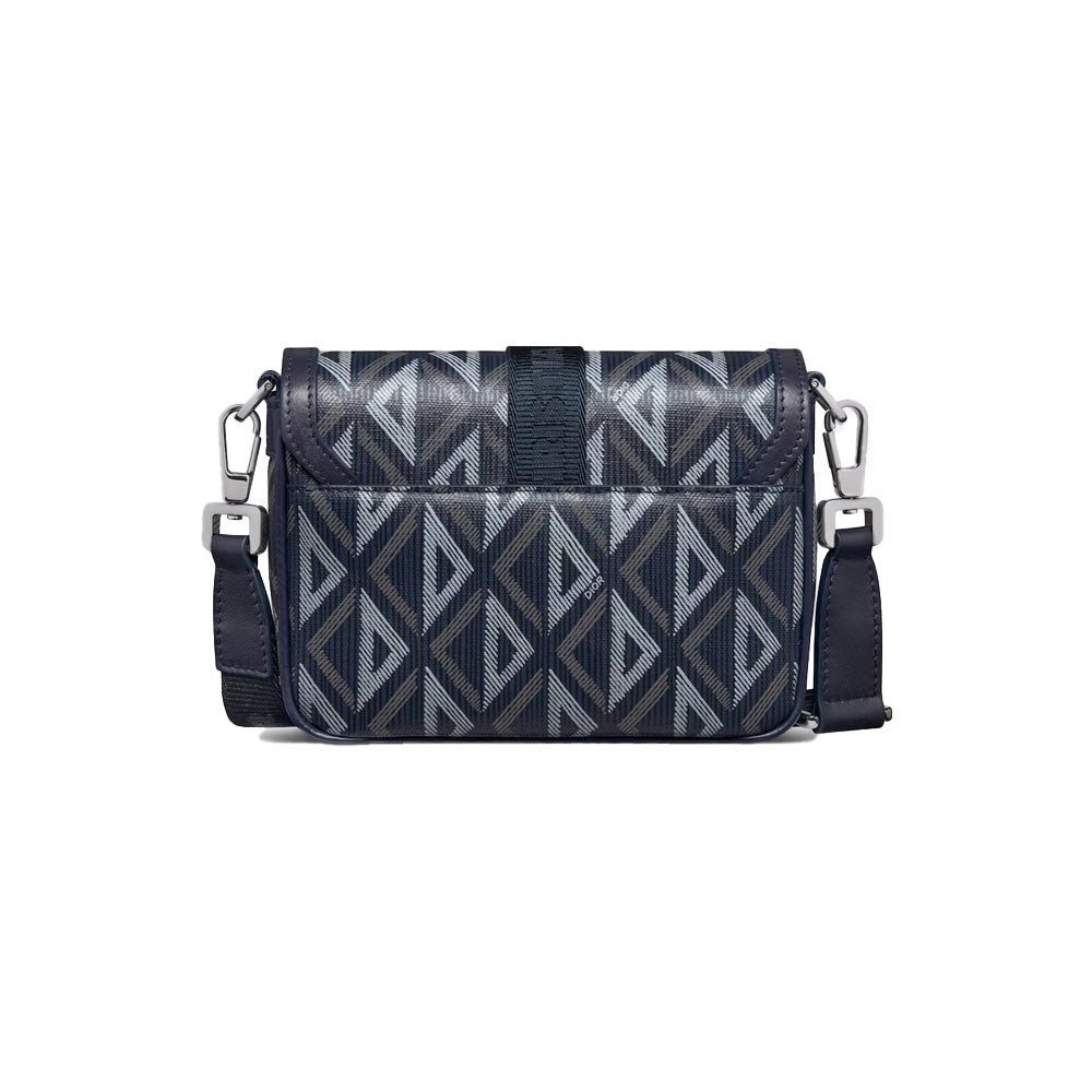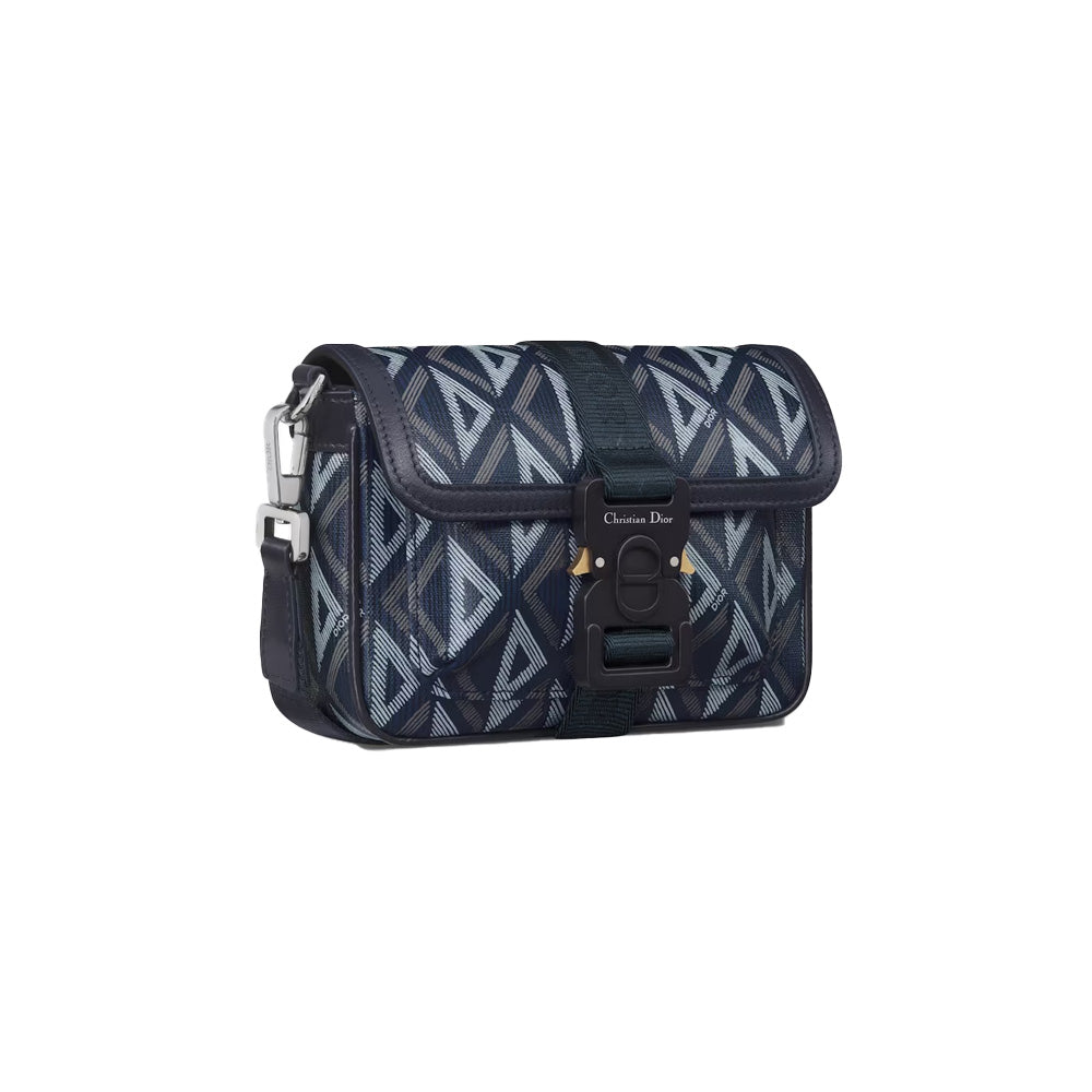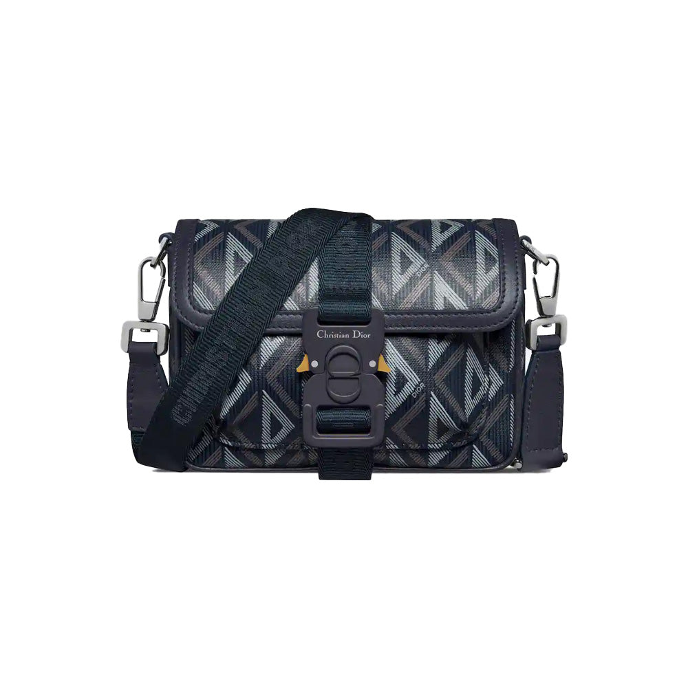 The Dior Hit The Road bag combines modernity with the House's couture spirit. Crafted in navy blue canvas with the CD Diamond motif inspired by House archives, it is enhanced by tonal smooth calfskin details. The flap features an aluminum buckle with the Christian Dior signature and CD initials, revealing a main compartment that can accommodate a phone and that features a patch pocket on the front. Complete with a removable and adjustable shoulder strap, the miniature, practical bag will lend the finishing touch to any casual outfit.