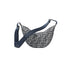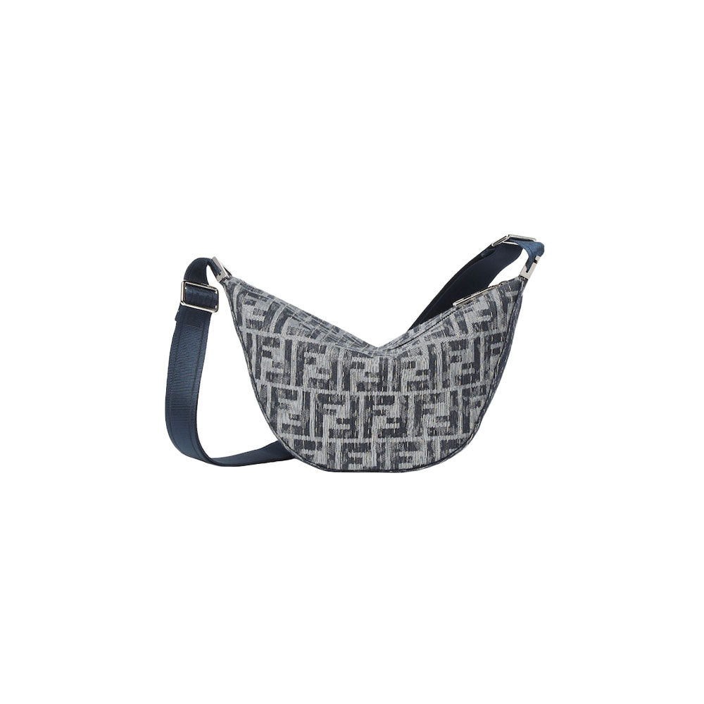 Small Fendi Melon crescent-shaped messenger bag. Made of denim-look fabric with FF in shades of blue, embellished with all-over contrasting vertical stitching inspired by the iconic Selleria workmanship. Decorated with FF metal appliqués on the corners.