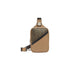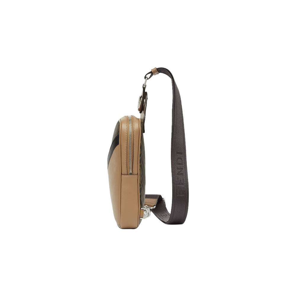 Rectangular belt bag made of brown FF canvas and beige leather, with a black leather diagonal insert. The design is distinguished by the metal rivet with an engraved FF logo that allows the strap to be rotated.