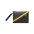 Clutch with removable bracelet handle, internal card holder and diagonal zipped pocket on the front. Zip fastening. Made of textured grey fabric with FF motif. Embellished with black leather insert and yellow inlaid detail. Palladium-finish metalware.