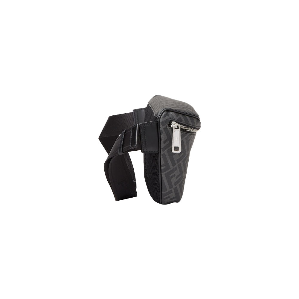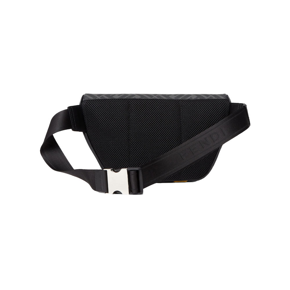 Belt bag with zip fastening. Adjustable belt. Made of textured grey fabric with FF motif. Embellished with black leather insert and yellow inlaid detail. Palladium-finish metalware.