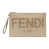 Large pouch with removable bracelet handle. Zip fastening. Made of beige leather with Fendi Roma print. Gold-finish metalware.