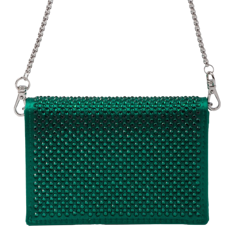 This satin card holder with a luxurious yet versatile design is embellished with all-over crystals that create plays of light and iridescent glimmers on the surface. The detachable chain shoulder strap makes it possible to wear the accessory, complete with the iconic enameled metal triangle logo, in different ways.