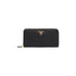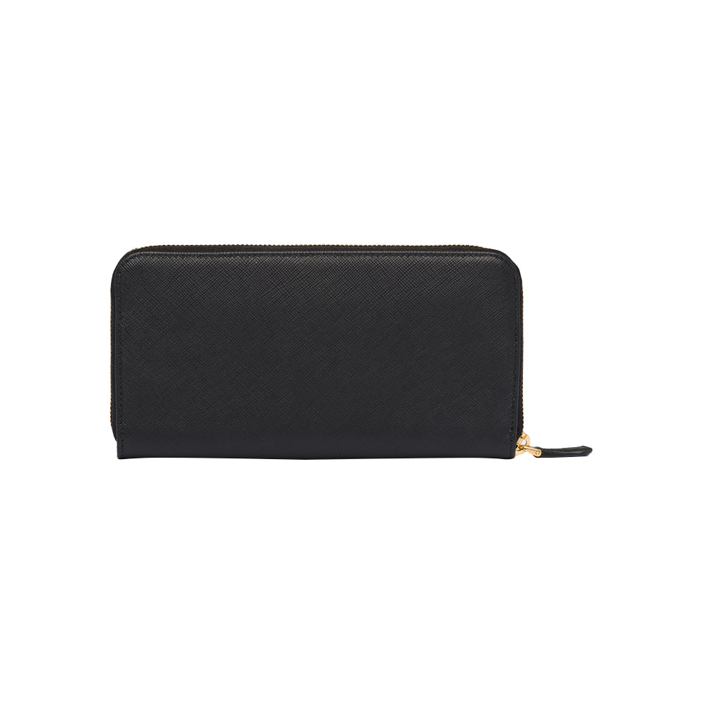 This zipper wallet is made of Saffiano, an iconic Prada material: calf leather of the highest quality, defined by a crosshatch texture and a waxed finish. The lettering logo decorates the accessory.