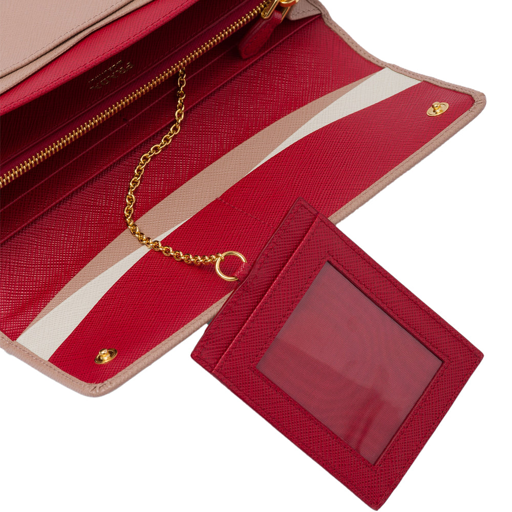 A Saffiano leather flap wallet with gold-finish Prada lettering. The monotone exterior hides multi-colored leather lining inside, as well as various compartments, pockets and an extractable badge holder.