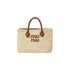 - An exotic look and summer inspiration characterize this palmetto handbag. The braided leather handles add a refined contrast in color and texture and echo the Miu Miu logo, a detail that completes the design with an iconic note.