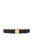 Fine leather belt, with punch hole closure and round Medusa buckle.